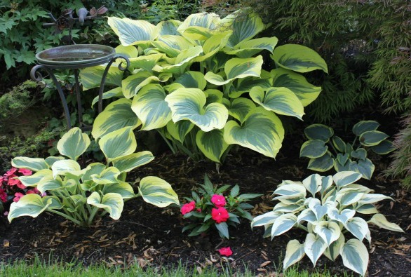 Hosta – These low-to-the-ground plants provide great foliage and their flowers add a simple flair, usually in a lavender color which is calming in the cool shade hosta generally grow in.