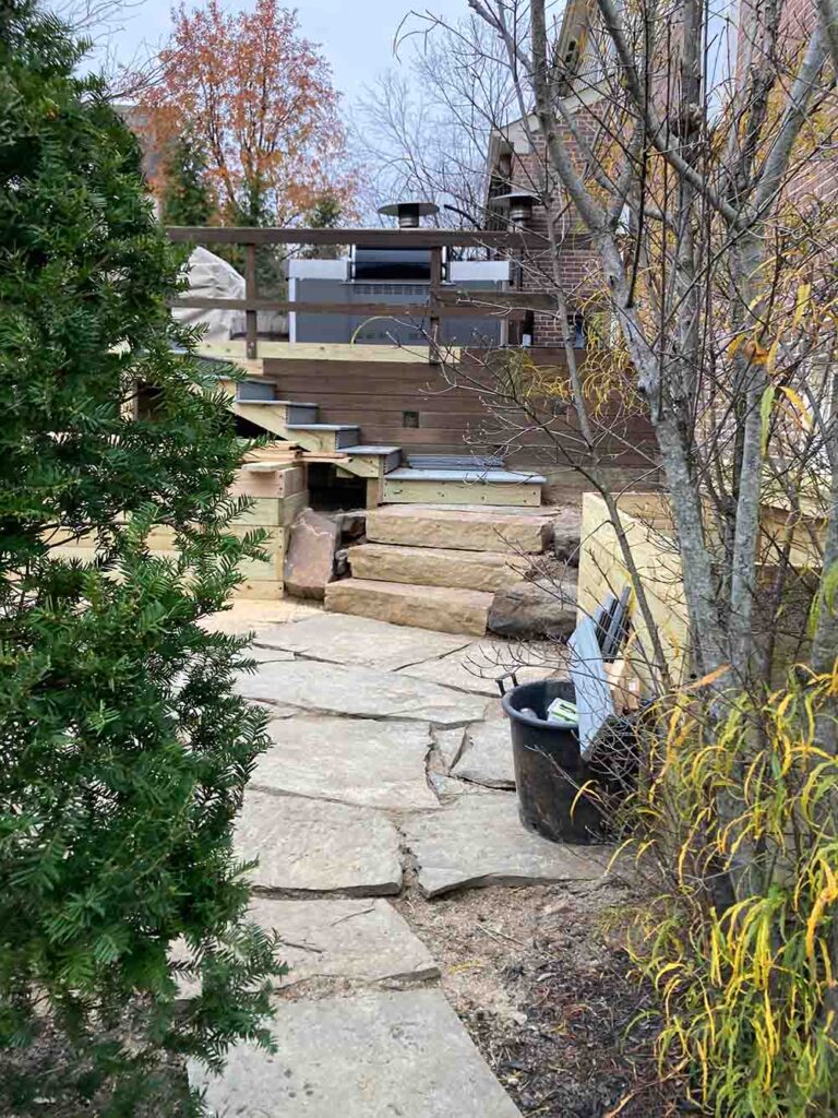 There are multiple strata in the backyard: a deck on the upper level of the house; an outdoor living area from the walk-out basement, a hot tub area, and a vista viewing area. With this new vision for their backyard, we had to ensure that the numerous walkways and steps were seamlessly integrated into the final design.