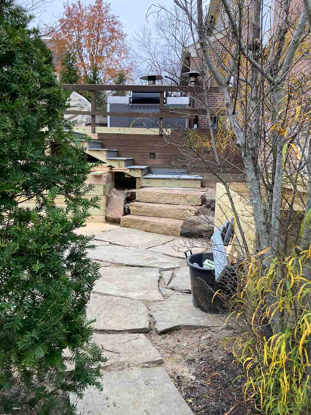Down from the garden, we created a new mini sitting area made out of flat stones. Since the property is located on a corner with great views of the neighbor’s driveway, we added two panels of decorative fence to create some intimacy.