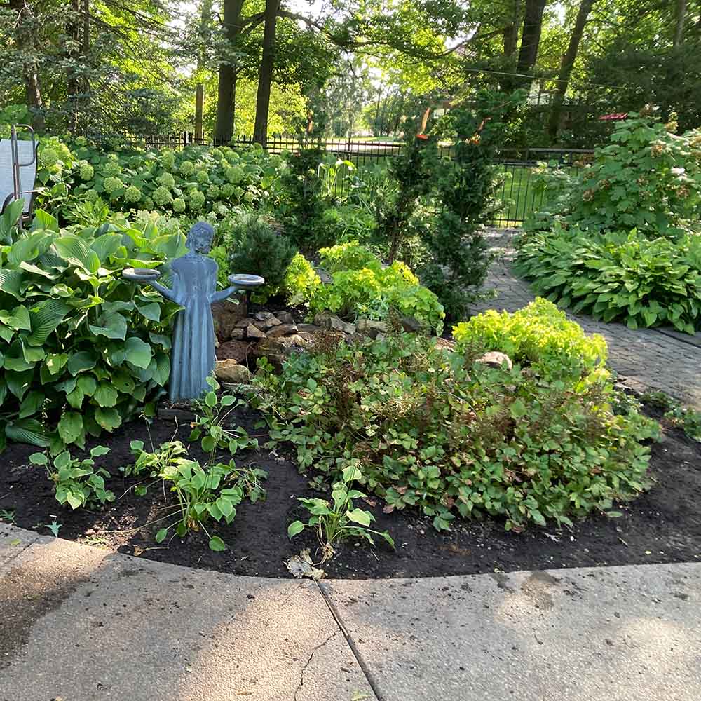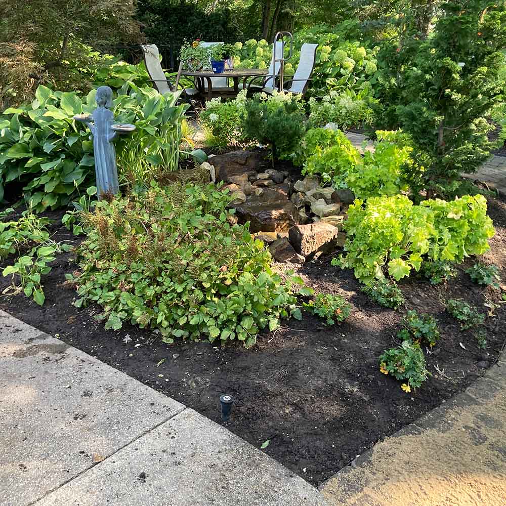 Plants grow as they are supposed to, so as expected, this year it was time to refresh the design. Our plan was to rehome, reuse and replace as needed. Many of the Hosta had matured to the point where they were taking over. Some stayed where they were, some were transplanted around the property, and some came back to our garden. Then we added some perennials: Autumn Morr grass, Caramel coral bell, perennial geranium, and dwarf hydrangea. We chose specimens that either already existed on the property to create a cohesive look or would add a unique texture or color. Our clients also wanted summer color for the pool area. For winter visual interest, we also added dwarf conifers and three tall, narrow, slow-growing evergreens. Finally, we rebored the moses rock from ½” to 1 inch hole and added a large pump so it gurgles very nicely now!